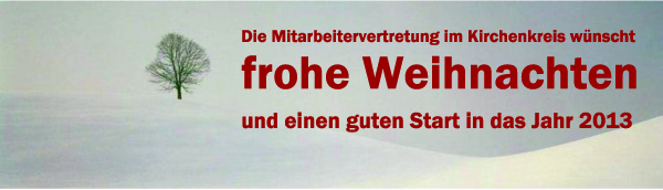 Die Mitarbeitervertretung möchte Sie / Euch zu einer Mitarbeiterversammlung am 28. November ab 14.00 Uhr in die Friedenskirche, Auf dem Hagen 23, einladen. In der Mitarbeiterversammlung werden die KKT-Vertreter aus der Mitarbeiterschft gewählt. Einen Referenten haben wir zu dem Thema: "DGB-Index Gute Arbeit" eingeladen. Die Einladung zu der Mitarbeiterversammlung wird aktuell an alle Mitarbeiterinnen und Mitarbeiter verschickt. Bis zur Mitarbeiterversammlung, Ihre / Eure Mitarbeitervertretung. Einladung Mitarbeiterversammlung Nov. 2012 |