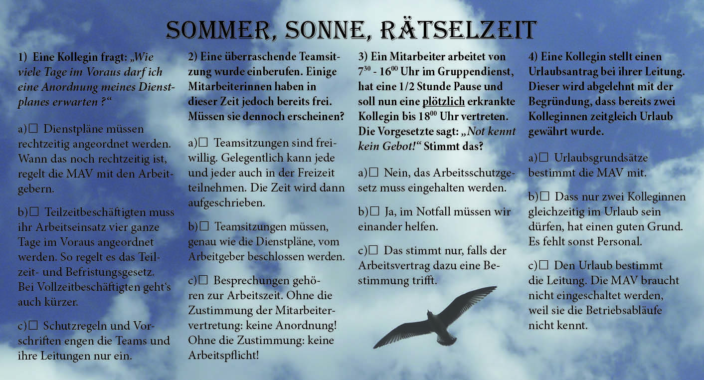 Die Sommerferien in Niedersachsen haben begonnen. Viele unserer KollegInnen gehen nun in den wohlverdienten Urlaub. Wir wünschen Euch allen eine schöne Sommerzeit. In diesem Jahr haben wir die Beschäftigten mit einer Postkarte angeschrieben und sie vor ein Rätsel gestellt. Eine Postkarte mit Fragen zum Arbeitsrecht (zum Dienstplan, Urlaub usw.).