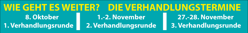 Auf der ver.di-Seite https://unverzichtbar.verdi.de ist folgendes zu der zweiten Verhandlungsrunde zu lesen: "Auch die zweite Verhandlungsrunde für die rund 1,1 Millionen Tarifbeschäftigten und 48.000 Auszubildenden der Länder ist am 02. November 2021 ohne Ergebnis zu Ende gegangen, wieder gab es kein Angebot. Die Arbeitgeber der Tarifgemeinschaft deutscher Länder (TdL) verweigern den Kolleg*innen Respekt und Wertschätzung, dagegen wehren wir uns, mit Streik und Druck." Weitere Informationen im ver.di: Flugblatt 2. Verhandlungsrunde: Null Angebot, null Wertschätzung ![]() |